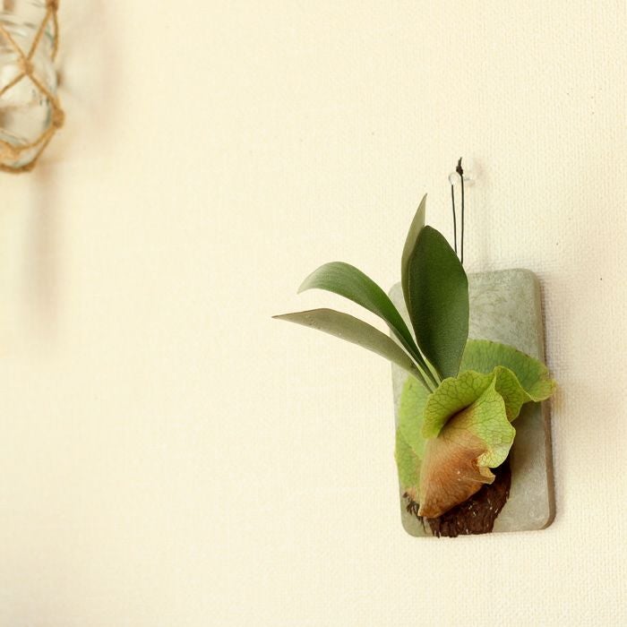 コウモリランは、ゆっくりじっくり貯水葉を伸ばし、プレートに着生していきます。従来の園芸植物のように、「どれも一緒」にはなりません。でも、そこが個性。