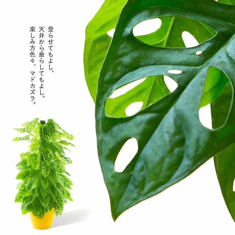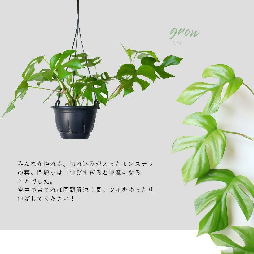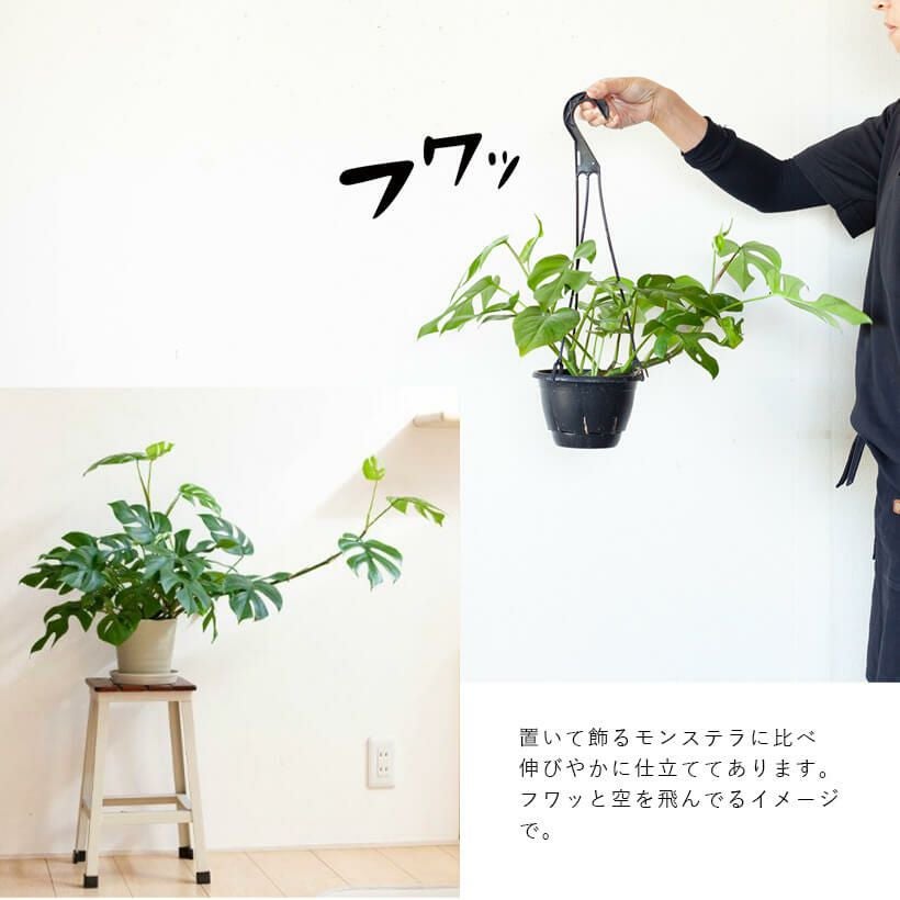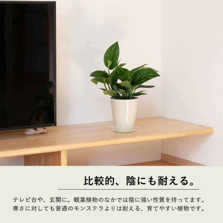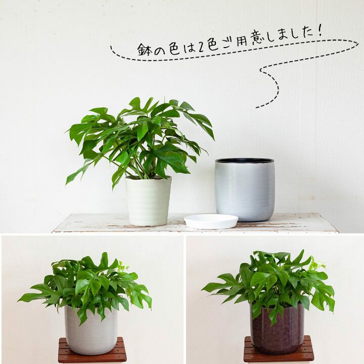 e-花屋さんは、家庭向け観葉植物の専門店。ですので育っても邪魔にならない、「姫モンステラ(ペルツーサ、アダンソニー)」を勧めています。