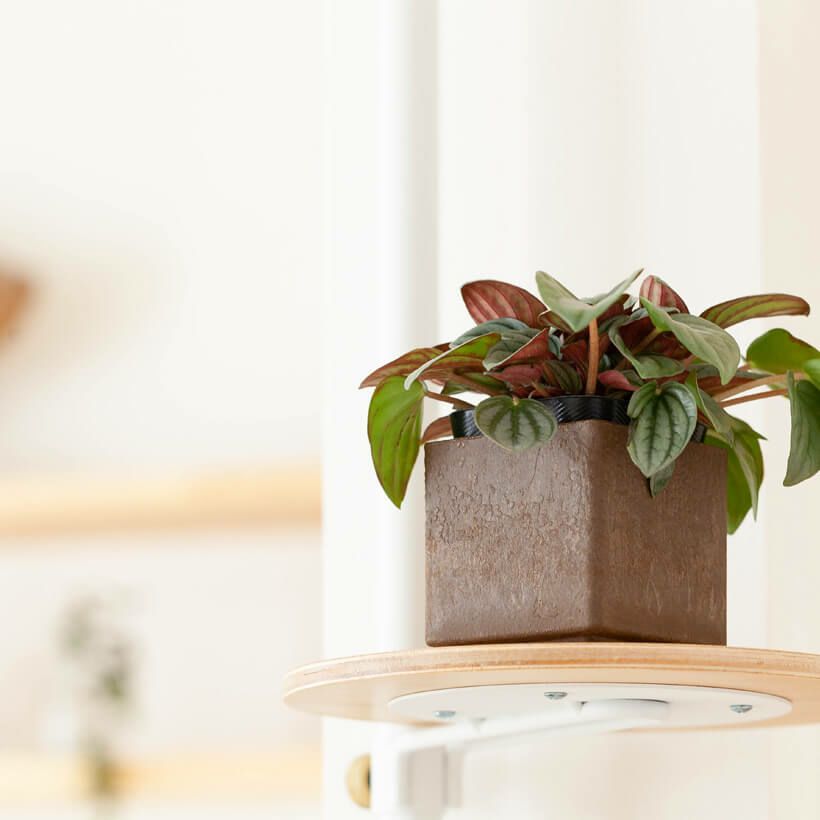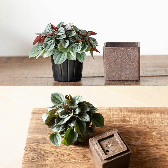 バイオマス素材(プラスチックに木材を混ぜて風合いを高めた素材)の鉢に、ペペロミア・ナポリナイツの3号苗が収まった状態でお届けします。
