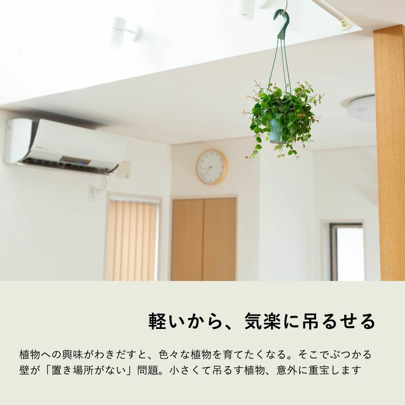 河合さんが作る吊り下げ植物、鉢の大きさは4号鉢サイズ。重さは水の具合によって変化しますが、おおよそ550~650g前後と非常に軽い。