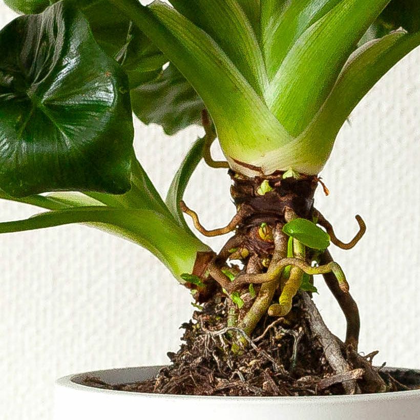 フィロデンドロン属の植物は、幹を持たない割にたくましく育つので、個性にあふれた形に育つことがあります。