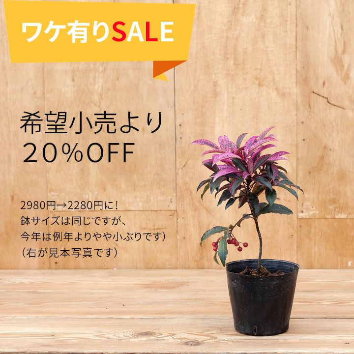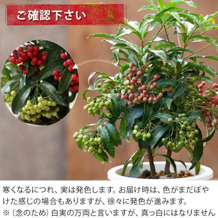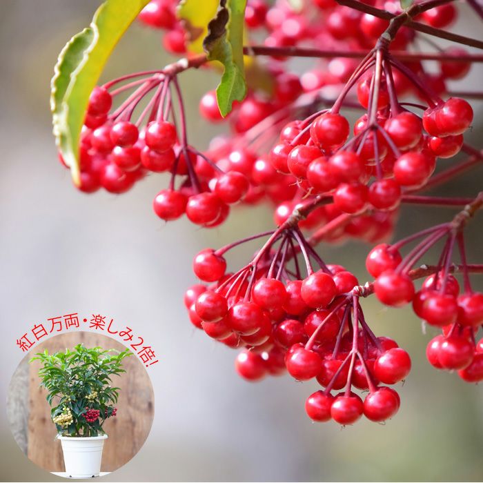 他の画像を見る 【今年が最後の販売となります】 【送料無料】紅白寄せ植え!めでたい大実万両 価格 ¥ 4,500 税込 入荷待ち +説明 赤実と白実。2株のマンリョウを寄せ植えした、おめでたい鉢植え。お正月にピッタリのお品です!予約期間は11月中旬~12月まで。お歳暮にも喜ばれるお品です。育て方ガイド付き!