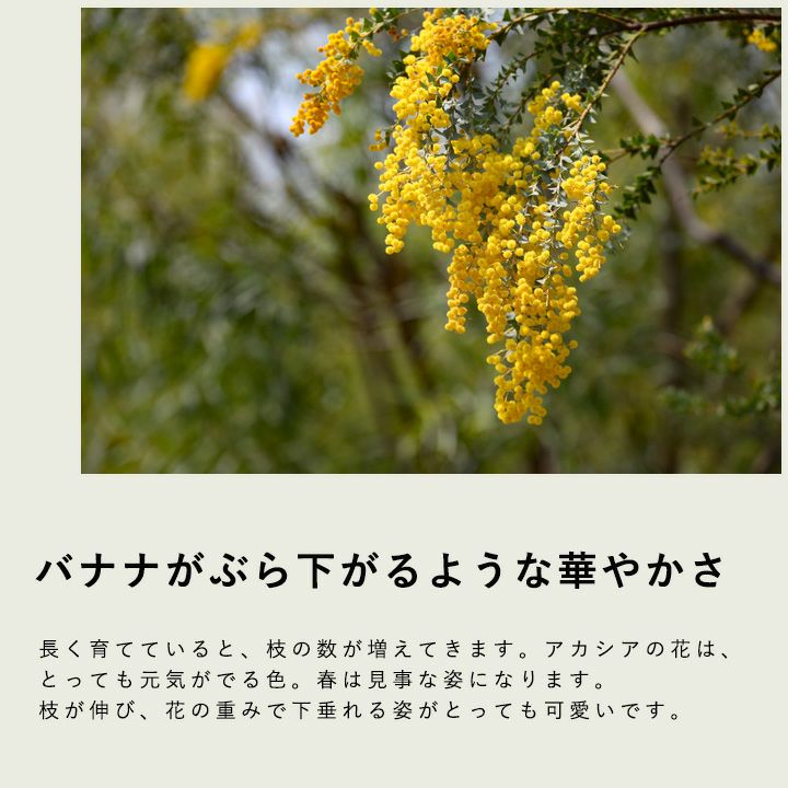 他の画像を見る 大好き!アカシアの人気品種 葉の色が綺麗!パールアカシア5号鉢 価格 ¥ 2,980 税込 4月~5月入荷の商品 入荷待ち +説明 シルバーブルーの美しい葉。ミモザ同様、黄色で房状の花を咲かせますがミモザより葉が大きく美しさが目立ちます。剪定しながら育てることで、木が倒れにくくなります。5号鉢です。7号鉢に植え替えてお楽しみ下さい。
