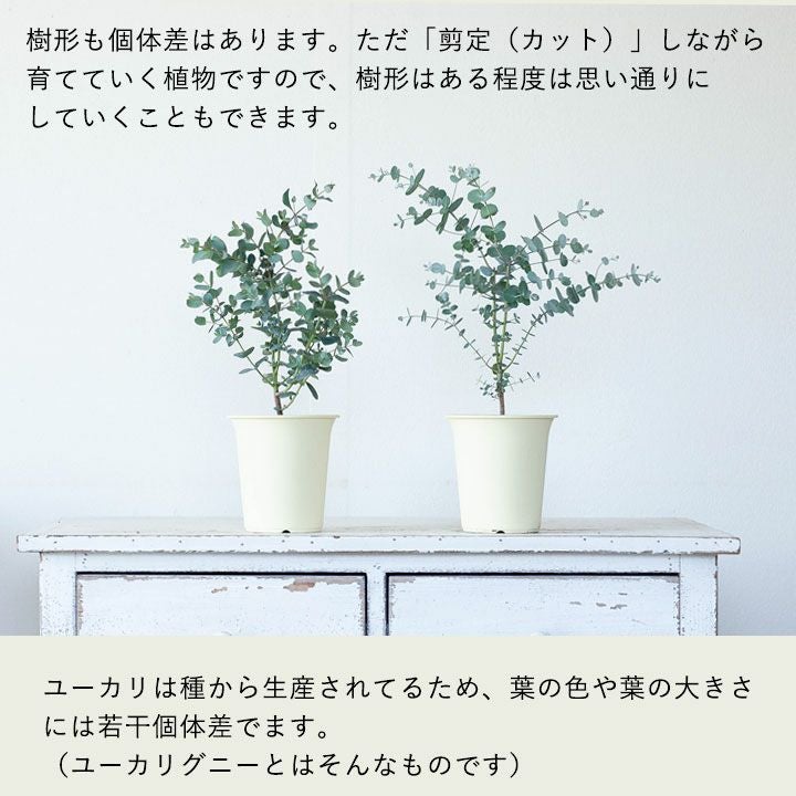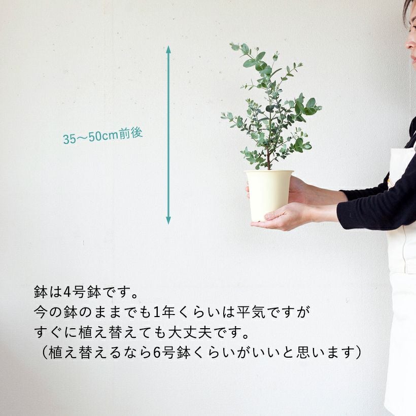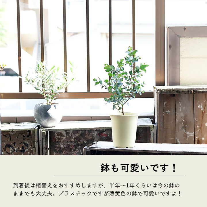 他の画像を見る 寒さに強い、屋外の植物です ユーカリ・グニー。始めてみるのに丁度いい4号鉢サイズ 価格 ¥ 1,188 税込 半年以内の入荷可能性あり 入荷待ち +説明 ユーカリ初心者さんはコレ!グニーユーカリ。ユーカリグニーは挿し木ではなく実生で生産されるため、葉色や葉の形など、個体差があります。育てやすい4号鉢サイズです。大きくしたくない人は小さい鉢で!
