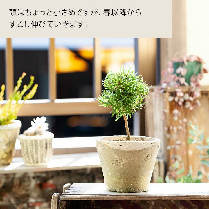 ローズマリーは他の植物くらべグリーンが濃いし、スタンド仕立ては姿も面白い。他の植物とのコントラストが可愛いですよ!