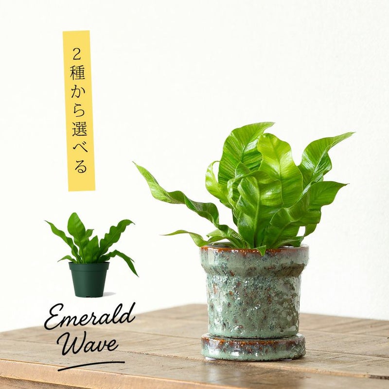 【水やりについて】 土の表面が乾いたらタップリと。シダ植物のなかでは、乾燥に耐える方です。なので「休日だけの水やり」でも大丈夫です。 【置き場所について】 シダ植物は強光を嫌いますが、エメラルドウェーブに関しては(室内の)日当たりでも大丈夫。陰にも強く、お部屋のなかのいたる場所で楽しめます。耐寒性の目安は8℃以上です。(水を控えればもう少し寒くても大丈夫です) |