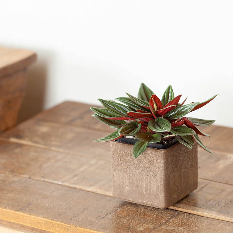 バイオマス素材(樹脂に木材を混ぜて風合いを高めた素材)の鉢に、ペペロミア・ロッソの3号苗が収まった状態でお届けします。