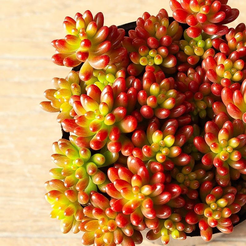 「ゼリービーンズ」のような美しい葉は、気温が下がるほど赤く染まります。寒さに強く、霜にあてなければ年中屋外でもOK!