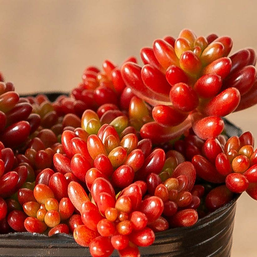 「ゼリービーンズ」のような美しい葉は、気温が下がるほど赤く染まります。寒さに強く、霜にあてなければ年中屋外でもOK!