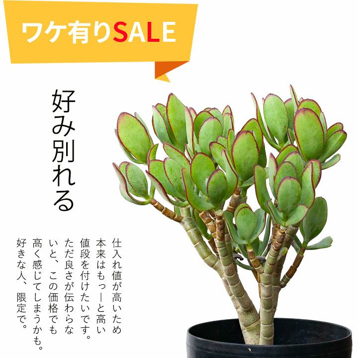 夏型の多肉植物です。冬以外はなるべく屋外の日の当たる場所が理想です。(ベランダや玄関先などいいと思います!) 見ての通り、木が成熟してます。花月(クラッスラ)は丈夫な植物ですが、年月が経ってる分より強さは増してます! 植え替えは急いでする必要がありませんが(今のままでも数年大丈夫)、鉢を替えると見栄えもグンとアップします! |