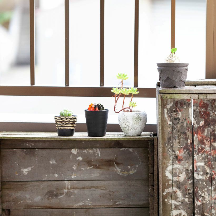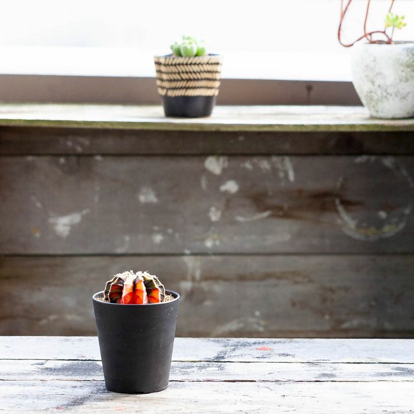 風合い良い、樹脂製の植木鉢にペペロミアアングラータを植えました。大人っぽい雰囲気で、オシャレです。マットブラック、陶器よりも素敵に見えます。あまり売ってないサイズ感。おすすめ!