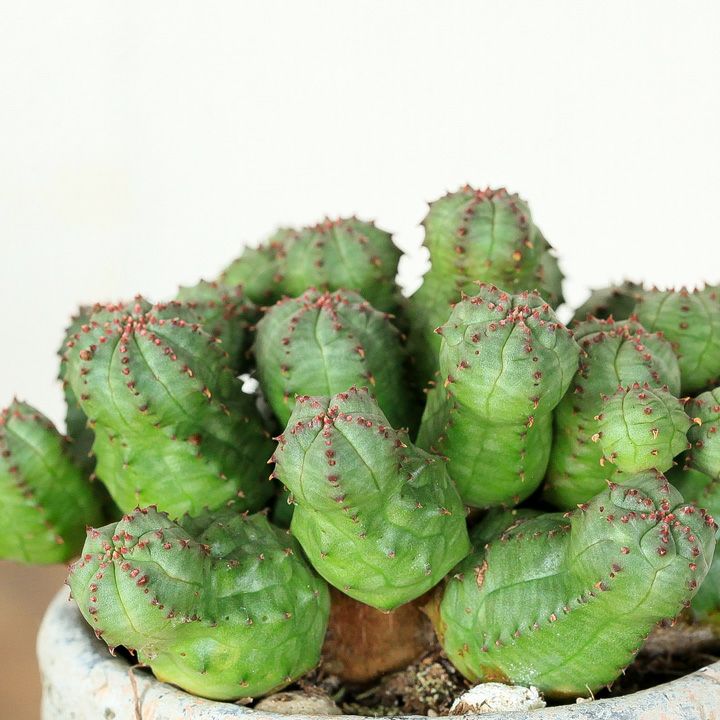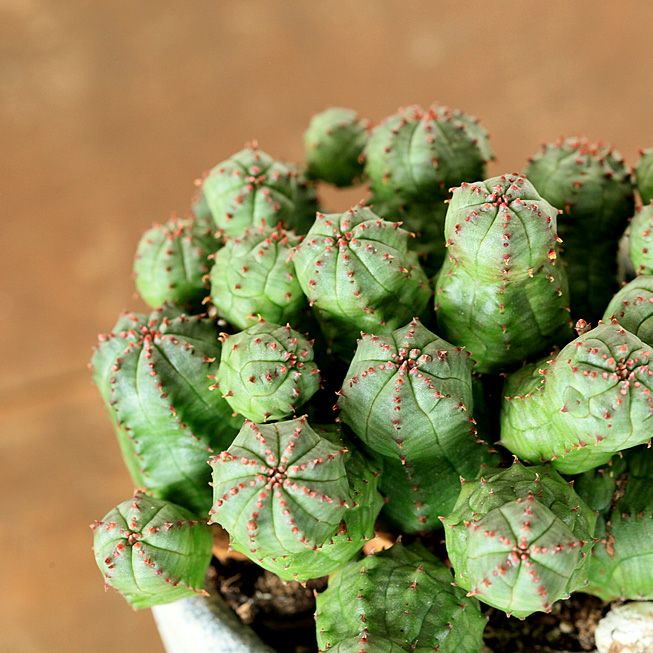 | 【育て方について】 ユーフォルビア属の多肉植物です。1年を通して日光のよく当たる、風通しの良い場所で育てます。 ただ夏は日光が強すぎるので、やや遮光した方が無難です。 日光が良くあたる場所、風通しが良い場所が好きなので冬以外は屋外の方がしまった株となります。冬は室内で(耐寒性の目安は5℃以上です) |