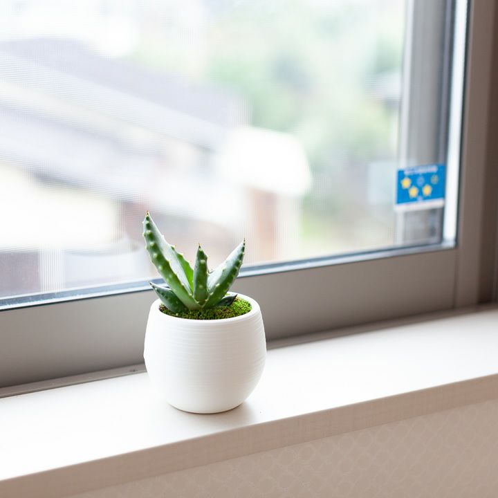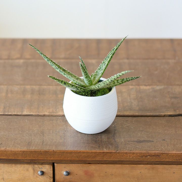 2号苗のアロエが、白いボールPOTに収まってます。 ボールPOTのサイズは 直径8cm 高さ8cm ※プラスチックです。受皿と鉢が一体になっているため、受皿は必要ありません。 |