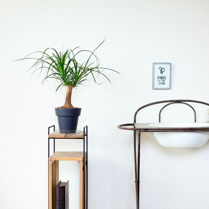 ポニーテール独特の太い幹、そしてそこからシャワーのように伸びる濃いミドリの葉。樹形はシンプルですが、この植物には「力強さ」を感じます。インテリアによく映えますよ!