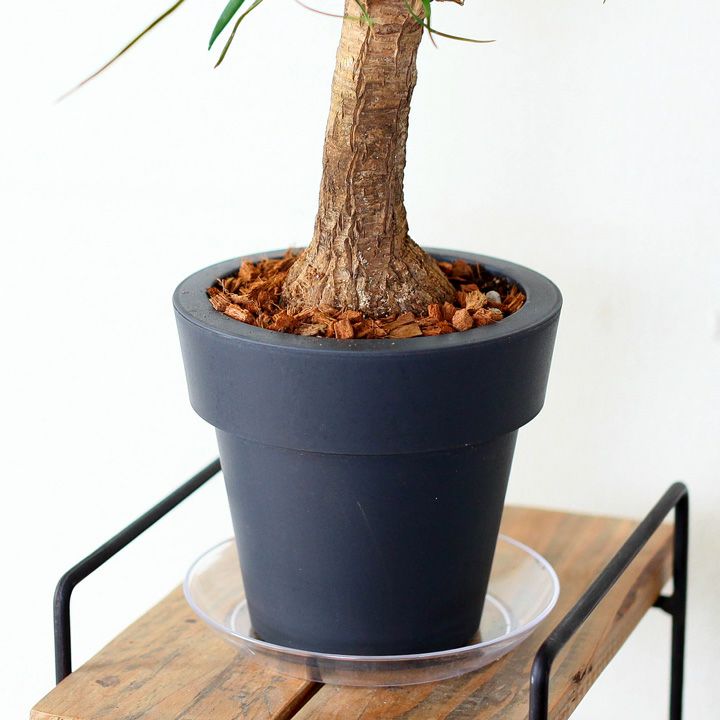 さらに「受皿」。この鉢に専用の受皿が存在しなかったので、透明の受け皿をチョイス。受け皿があることで安心して棚の上に飾れますし、インテリア性も損なわれませんよ!