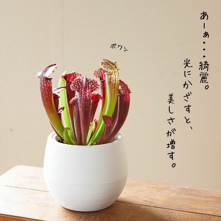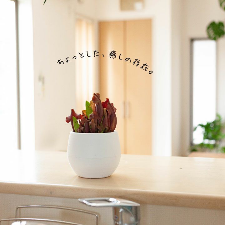 沼地に生える水が好きな植物です。乾かしすぎない様に、水はマメに与えてください。 ※日光に当たる場所の方が葉色が綺麗になります。日光が大好きで、真夏の屋外でも屋外で耐えるくらい丈夫な植物です。 (冬は葉が傷み、休眠に入ります。春、気温が上がれば新しい葉が出てきます) |