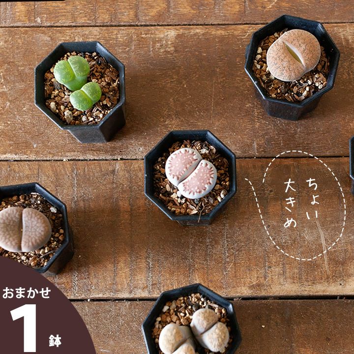写真は見本です。1つ1つ、姿が異なります。(どの品種が届くかはお任せとなります) 中には花が咲き、その花が終わってしまった株もございます。リトープスは数日で花が咲き終わってしまいますので、現実的にこれは仕方ないことです。 ただ花が咲いた株は、来年も咲く可能性が高いです。そういった意味で、「花が終わっている株が残念な株」ということではありません。「こういったもの」とご理解頂ければ幸いです。 ※葉には多少傷がある場合がございます。これもある程度、仕方ないことです。(この鉢サイズのリトープスでは、良品の部類に入るとは思います) |