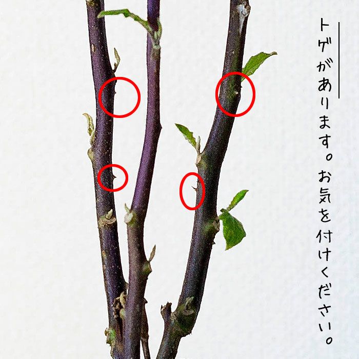 また実・葉には傷などがございます。屋外で生産される植物につき、どうしてもあることです。 茎にはトゲがあります。小さいお子様がおられる場合は、ご注意下さいませ。 |