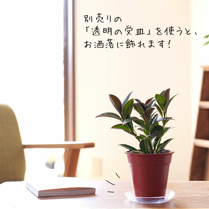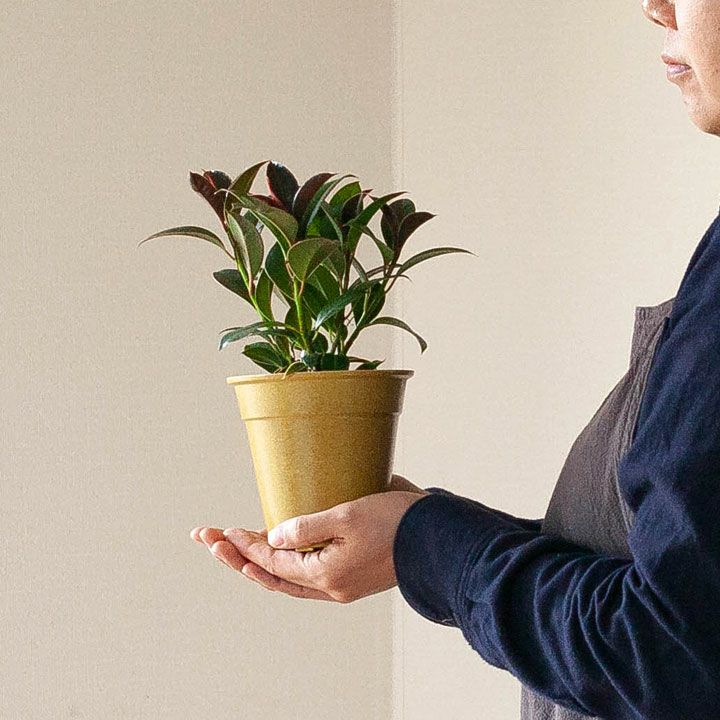 植木鉢に、フィカス・マイクロゴム(ゴムの木)の3.5号苗がスッポリ収まってます。植木鉢には排水穴がありますので、お好みによって受皿をご利用ください。 |