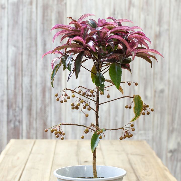 たくさんの万両から偶然生まれた美しくエキゾチックな品種。何度も選抜を繰り返し、最近やっと品種登録まで辿りついた価値ある希少な万両です。