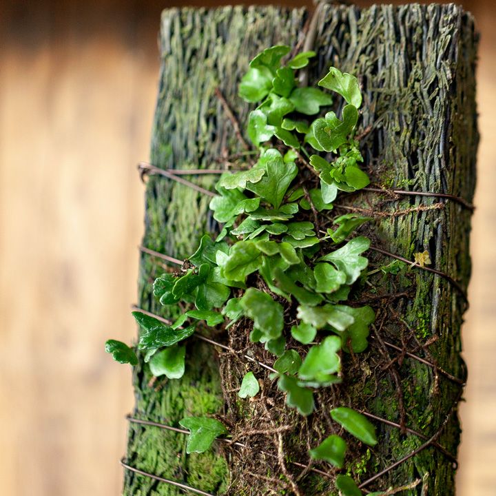 ※着生植物であるマメヅタをヘゴ板に番線でくくり付けてあります。またその状態から時間をかけて養生してありますので、マメヅタの根が一部ヘゴ板に活着(着生)してます。 |