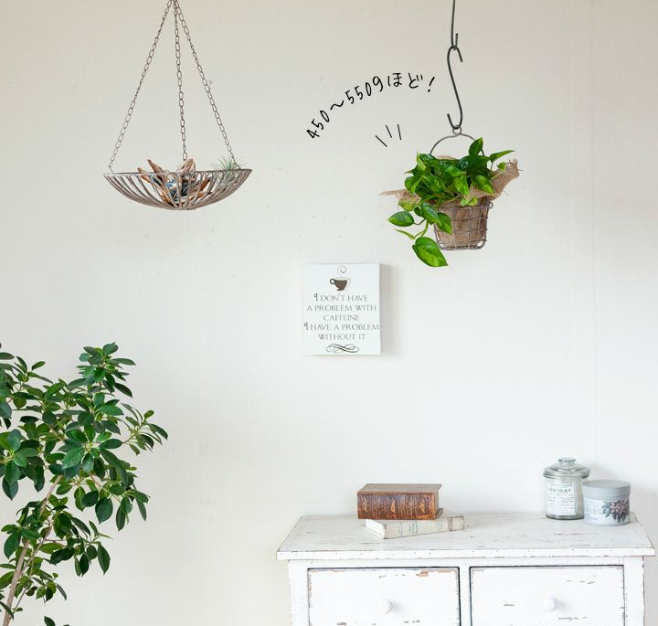 ワイヤーPOTにポトスを入れた際の総重量は400~500gほど(水の具合で変化します)。軽いので、飾りやすいですよ!