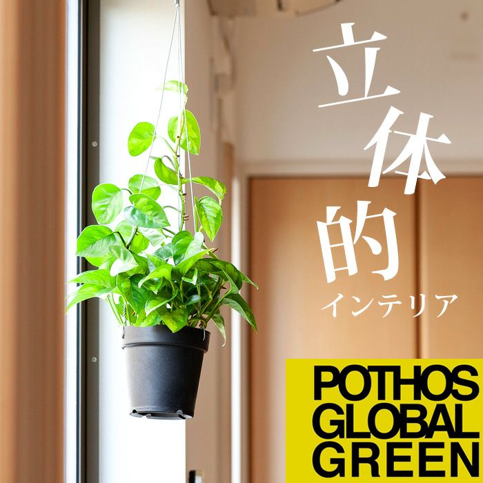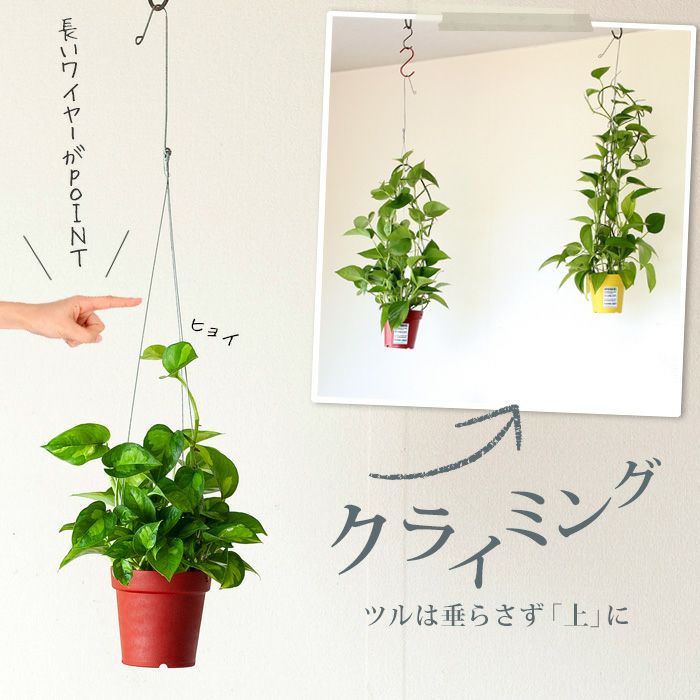 ポトス・グローバルグリーンは育てやすい観葉植物で、多少であれば陰にも耐えます。 乾燥にも耐えるので、水は休日だけでもOK。丈夫なので「吊り下げ植物」として優れてます。 時間が経てば、さらにツルは伸びます。ワイヤーに巻き付けたり、下に垂らしたりとお好みでアレンジできますよ! |