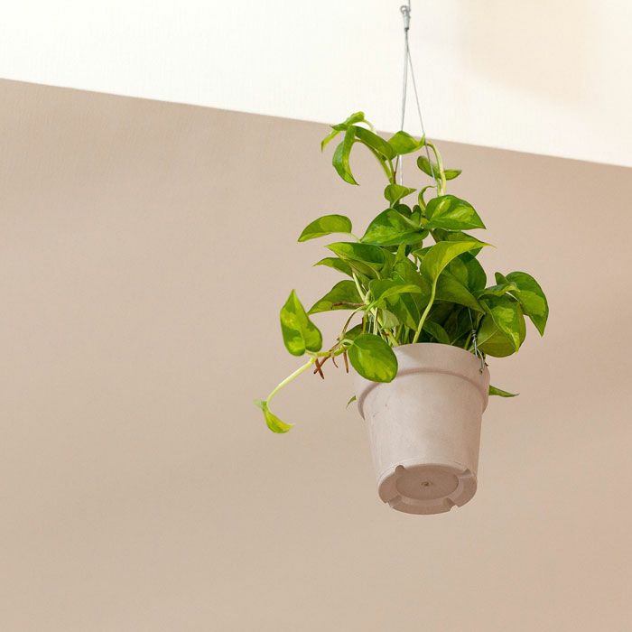 バイオマス素材(プラスチックに木材を混ぜて風合いを良くした素材)の鉢に、手作業でワイヤー吊り具を取り付けたオリジナルPOT。 非常に軽くて、高いところにも引っ掛けやすいのが特徴です。 (植物を含めた全体重量は500~600g程度です) グローバルグリーンは3.5号苗。通常の苗より時間をかけて、ツルを長めに仕上げています。 |