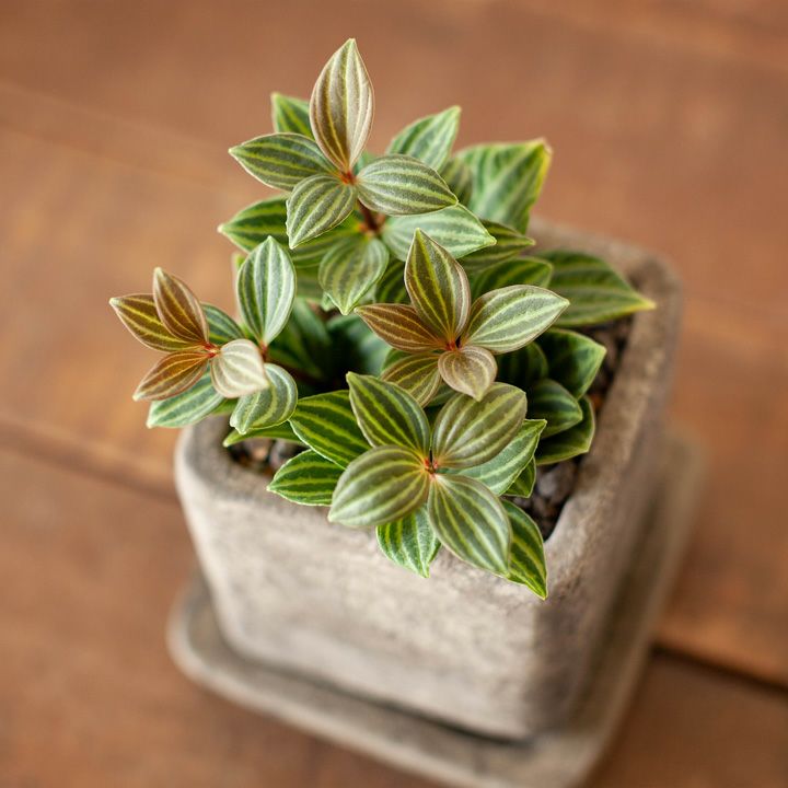 遠目からでも目立つ、縦縞のストライプ。男前な植物一覧ペペロミア・プテオラータ。 今回はプテオラータの凛とした個性が際立つように、落ち着いたトーンの植木鉢を選びました。