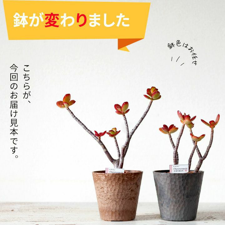 他の画像を見る 人気の多肉植物/風水 黄色い鉢は、風水的にもGOOD!金のなる木シンシン【斑入り花月】 価格 ¥ 980 税込 入荷待ち +説明 多肉植物のなかでも特に人気!斑入り金のなる木シンシン。風水で金運アップの色と言われる黄色の鉢を装着。育て方付きなので初心者にも安心です。水やりは控えめでOK。室内多肉のロングセラー商品です!