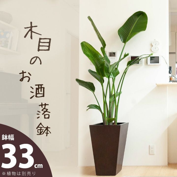 「木目調」で「背の高い」人気のデザイン。 他のメーカーでも類似品は探せます。 ただ比較した結果、この鉢がお求めやすく、使いやすい。 軽いし、お洒落。広めのリビングなどに! |