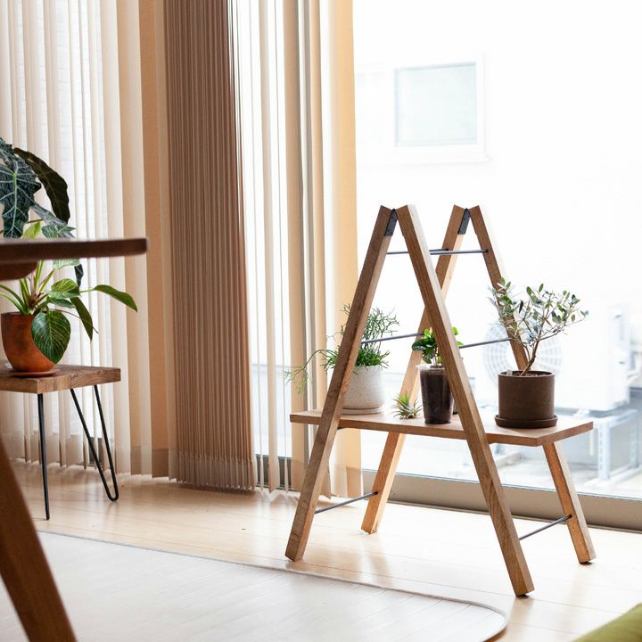 こちらの商品はラダー(はしご)を折り曲げ、間に板を通したもの。花屋や雑貨屋で使われる什器のミニチュア版です。