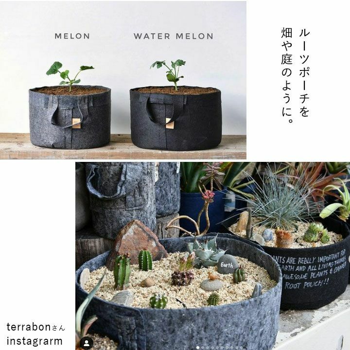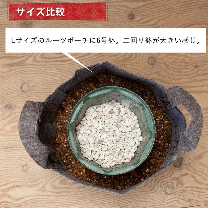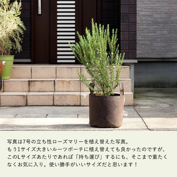 ルーツポーチは大型サイズもあります。なので「ルーツポーチで植えた植物をルーツポーチに」という方法も。