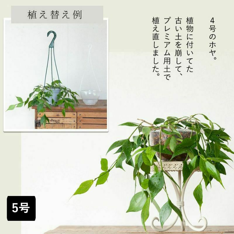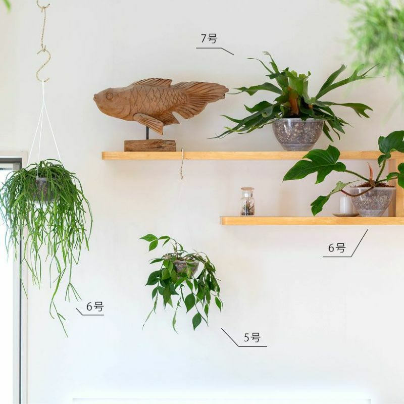 上の写真は3.5号のフィロデンドロンの植替え例。フィロデンドロンのように「広がって困る」植物は、吊るしてみて!