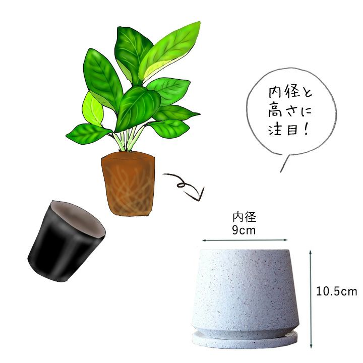 ②植え替える鉢の「内径」と「高さ」が、植物より大きいことが条件です。