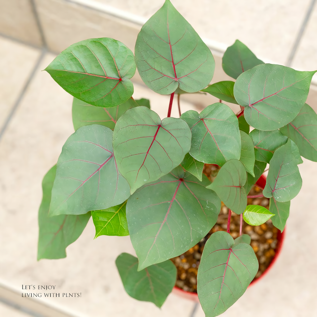 また、葉はウンベラータのようなハート形をしていますが、ポイントは葉脈の色。紫外線をしっかりと浴びることで、葉脈は赤紫に染まります。葉も幹も、魅力の高い植物です。