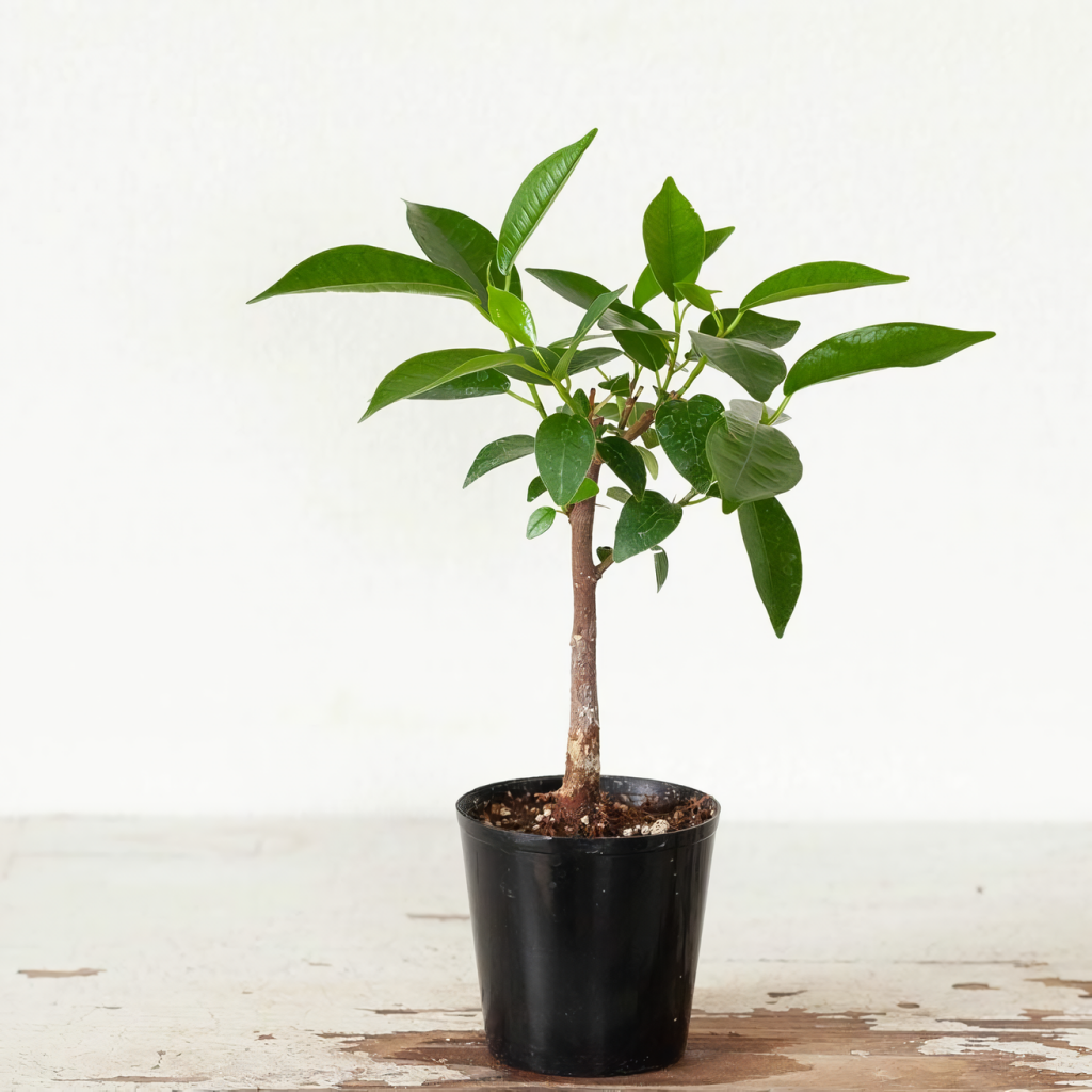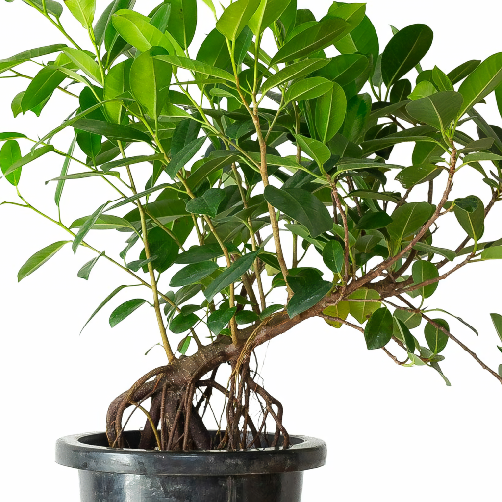 深緑の落ち着いた小ぶりの葉と、上品な幹肌が特徴の品種。主張が強すぎず(癖が無い)、インテリアに馴染みやすい優等生です。また、枝が比較的柔らかく曲げやすいため、風合いのある曲がり仕立てが多く流通します。