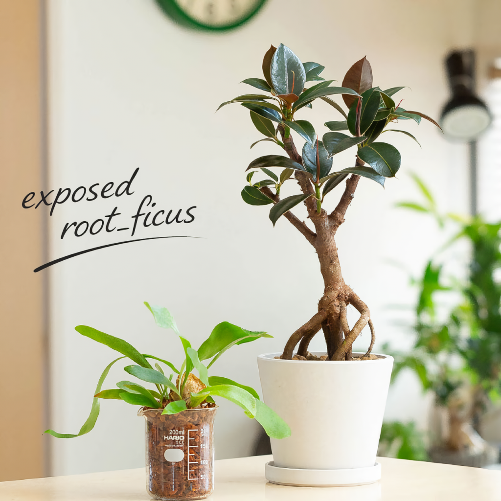 農家さんによって方法は異なりますが、大体の場合は一度深く植えたフィカスを掘り上げて、再度浅く植え込みます。手間がかかる仕立てなので、流通している量も比較的少なめ。良い仕立ての物が出ていれば、滅多に出ないかも!という気持ちで見てみてくださいね。