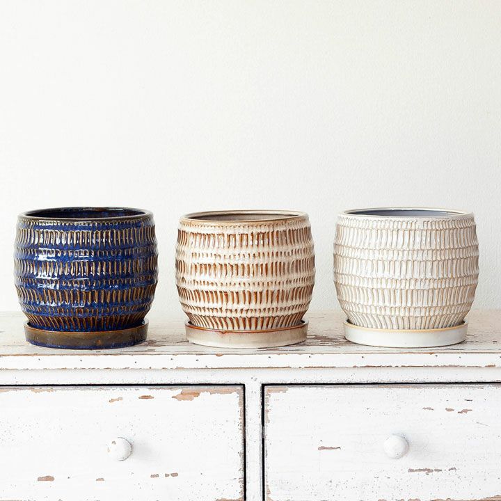 石垣の模様を彫り込んだ、国産陶器鉢(杉彫り)